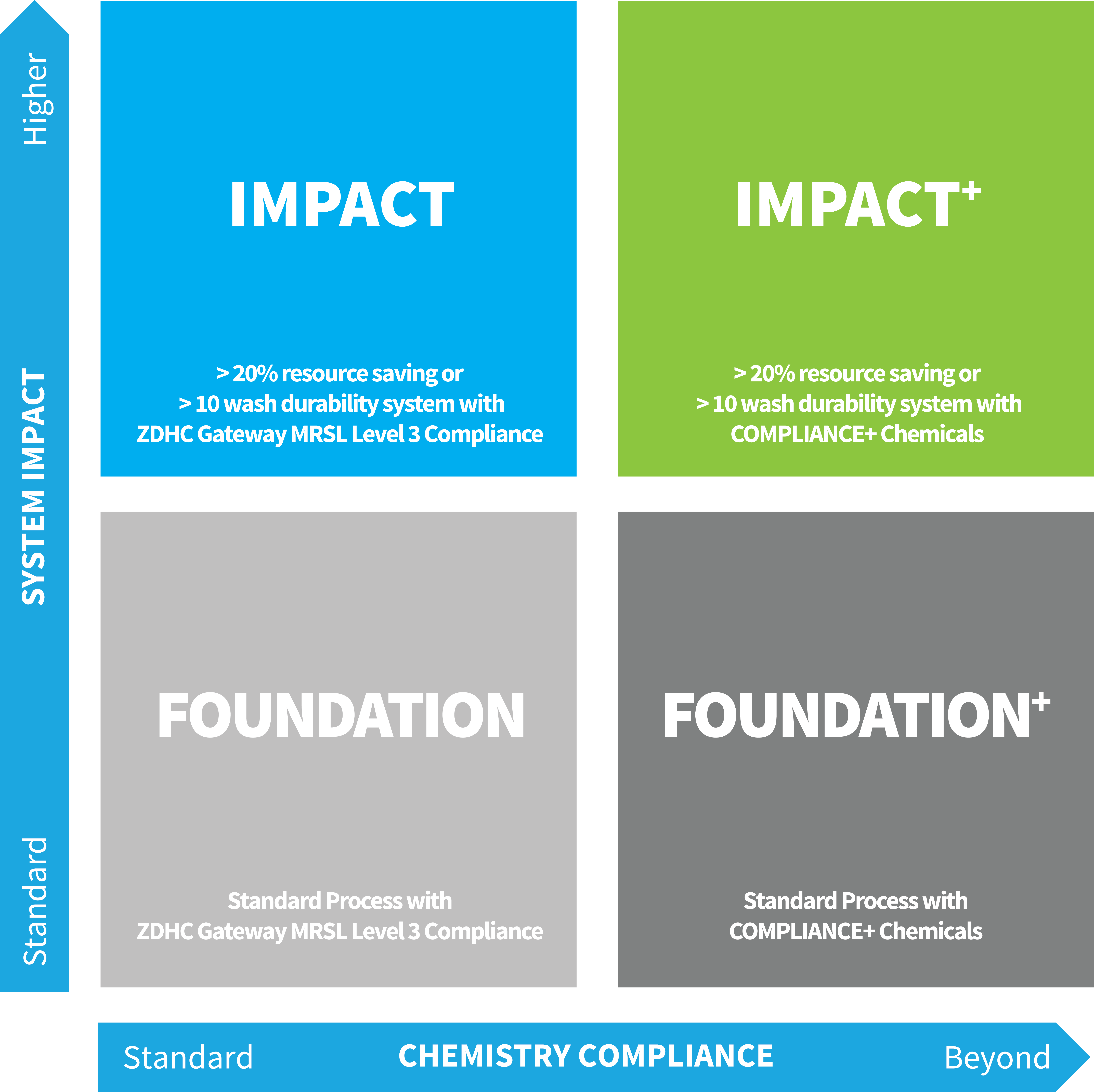 With SUPER SYSTEMS+, brands and mills can select the impact they want to achieve in line with their sustainability goals: from FOUNDATION level for standard processes with ZDHC Gateway MRSL Level 3 compliance to IMPACT+ for maximum resource savings, high wash durability and beyond-compliance chemicals.