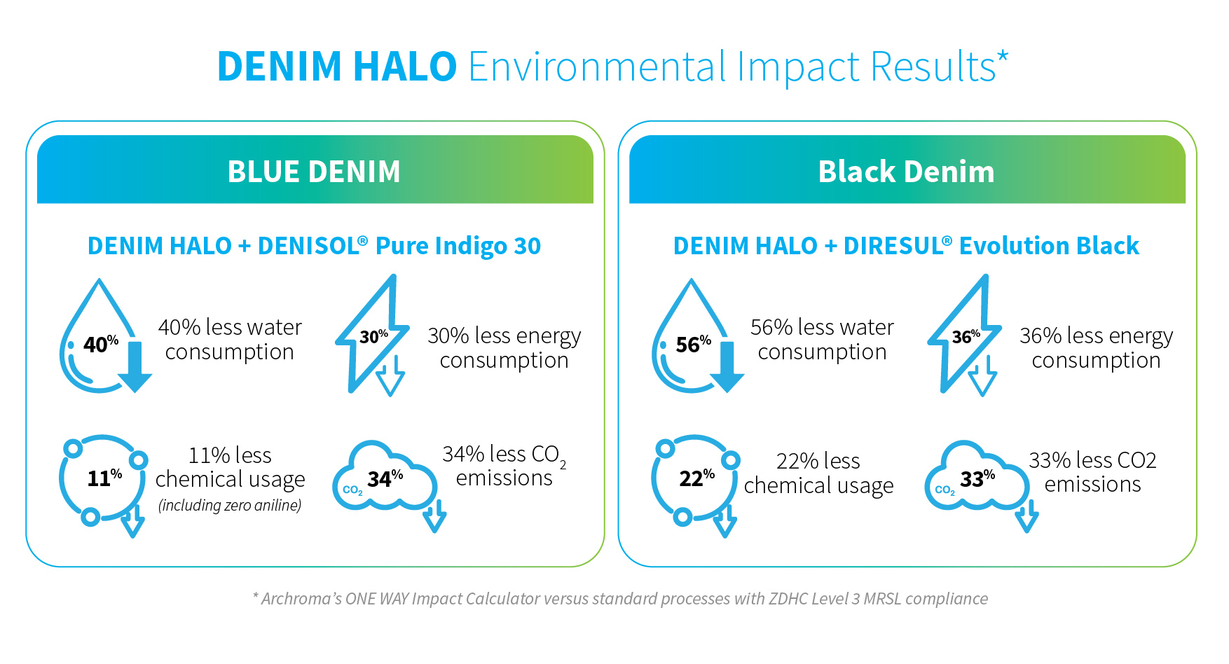 Impact assessments using Archroma's ONE WAY Impact Calculator demonstrate substantial environmental benefits for DENIM HALO versus standard processes with ZDHC Level 3 MRSL compliance. Results include water savings of 40-56%, energy reductions of 30-36%, and CO2 emission cuts of 33-34% depending on the dye formulation used. [See infographic: DENIM HALO Environmental Impact Results]
